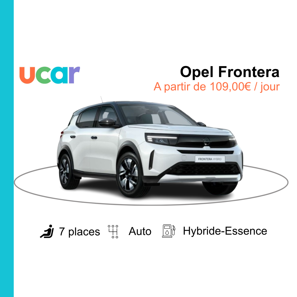 Profitez dès maintenant de notre Opel Frontera GS 7 places hybride automatique, un SUV moderne, économique et parfaitement adapté aux familles nombreuses ou aux groupes.